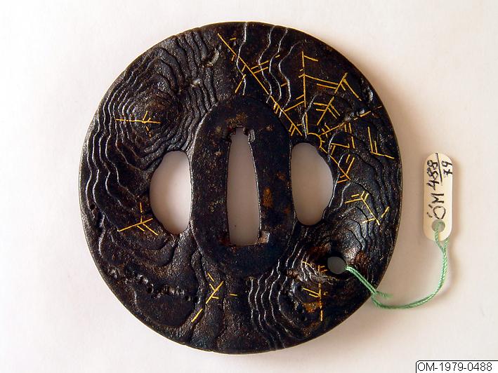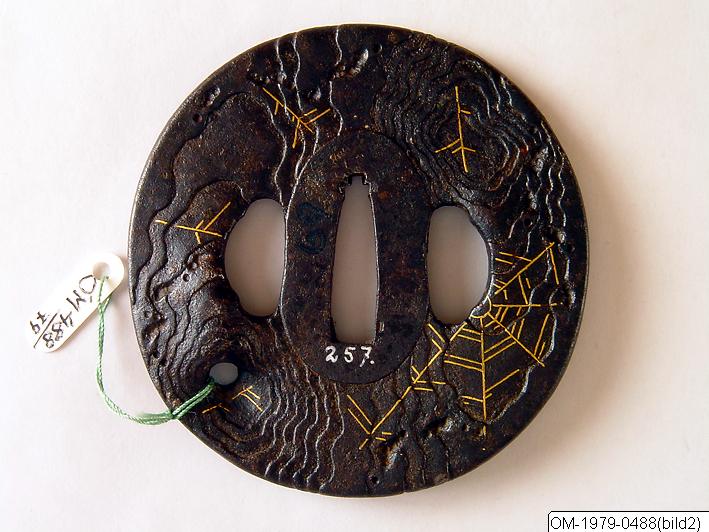 Rund tsuba av järn med delvis rundad, delvis rak kant. Denna tsuba som inte är helt platt, utan något “bucklig”, är utformad som ett tvärsnitt genom en trädstam. Reliefpartier visar träets ådring. På bägge sidor stiliserade spindelnät inlagda med guld. Hål för kodzuka och kogai samt en udenaka-ana.