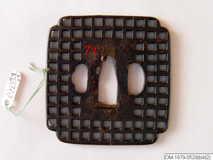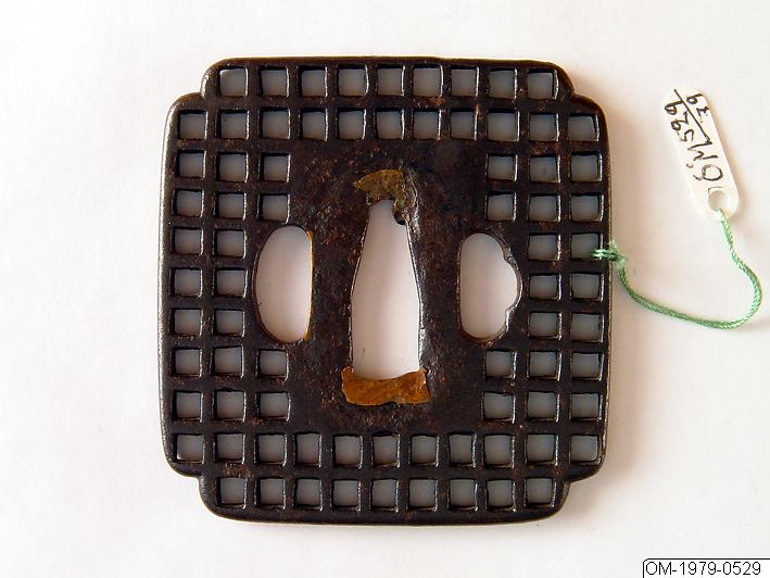 • Fyrkantig tsuba av järn med avfasade hörn och rak kant. Antydd Mokko-form. Förutom kanten och den rektangulära seppa-dai består denna tsuba av ett rätvinkligt gallerverk av genombrutna kvadratiska hål. Hål för kodzuka och kogai. Sannolikt 1600-tal.