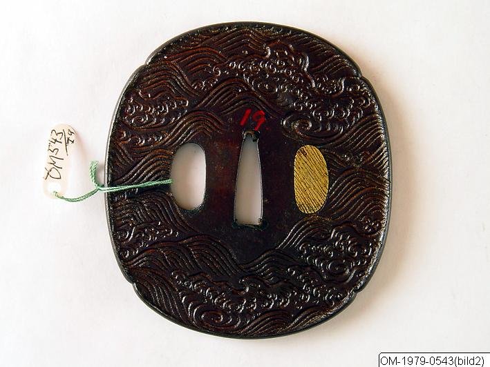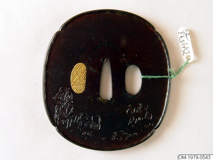 Oval tsuba av järn, med antydd fyrpass form med förhöjd, nästan rak kant. Framsidan dekorerad i ristad teknik med tre svampletande män med korgar, och en med en skära. Baksidan dekorerad med ristade vågor. Hål för kodzuka och kogai; det förra igensatt med guld. Ganska stumt och okänsligt arbete.