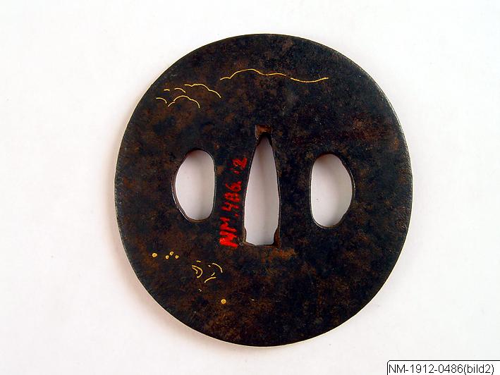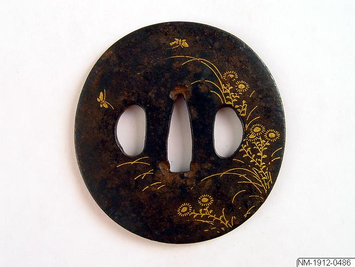 Enligt katalogkort: “Parerplåt, Tsuba av järn, nästan cirkelrund med tre klinghål. Å frams. krysantemumplantor och fjärilar i guldinläggning. Awa-rog...-arbete. Ej sign.”