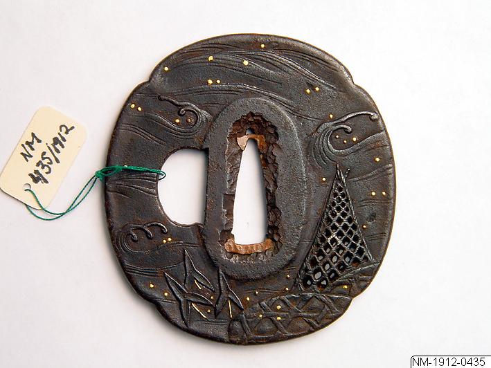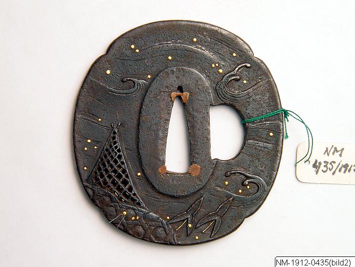 Tsuba (parerplåt) av järn. Enligt katalogkort: “Parerplåt, Tsuba av järn, svagt utbildad mokkoform med två klinghål. Dekor (å båda sidor) upphängt nät och ryssja bland stiliserade vågor. Ciselerat delvis genombrutet med inlagda guldprickar. Ej sign.”