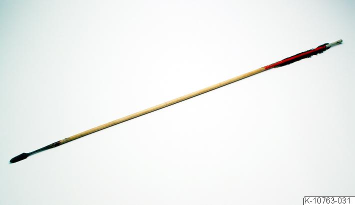 Pil med fjäderförsett, delvis rödmålat träskaft och metallspets.Förvaras på ställning i rum D.