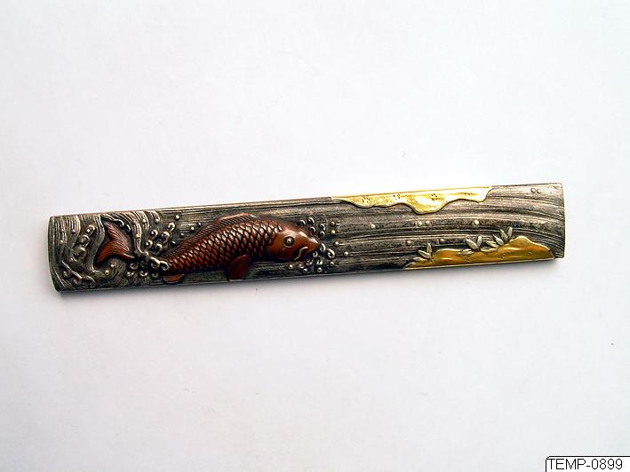 Kodzuka av metall dekorerad med fisk i vatten, i relief med inlagda metaller. På baksidan inskurna tecken. Vid tillfället för inventeringen låg tillsammans med detta föremål en lapp med texten “Kellström”. OBS! Jämför med TEMP-0900.