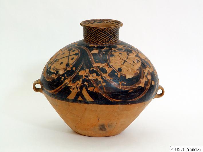 Kruka av lergods med målade mönster i svart och violett. Krukan har slagits sönder och restaurerats och ytan är skadad. På krukans undersida påskriften “Pien Chia Kou Pot 7 797”. Krukan ingår i det gravgods som omgärdat skelettet i montern i stenålderssalen. Tillfälligt placerad i Japan-salen.