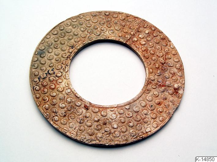 Bi-skiva av jade dekorerad med små runda upphöjda virvlar på båda sidor. Skivan har slagits i 3 delar och lagats. Från låda märkt “Jader (Pi)”.