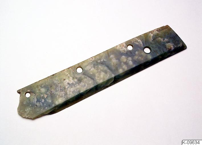 Föremål av jade, möjligen något slags blad, med fyra hål. Från låda märkt “Jader (Vapen)”.
