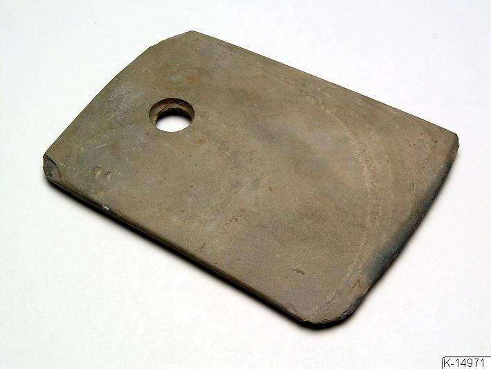 • Föremål av sten, möjligen en yxa, med ett hål. På föremålet finns ditsatt två etikett, en med texten “Bluett & Sons London”, den andra med påskriften “A.H 762”.