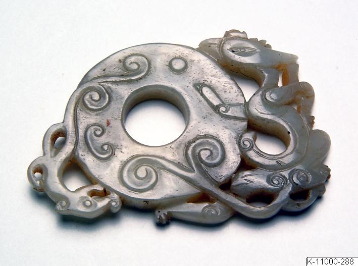 Ornament av jade i genombrutet arbete. På föremålet finns numret “489” skrivet i svart färg. Från låda märkt “Jader Ej gammalt (Diverse ej jader)”.