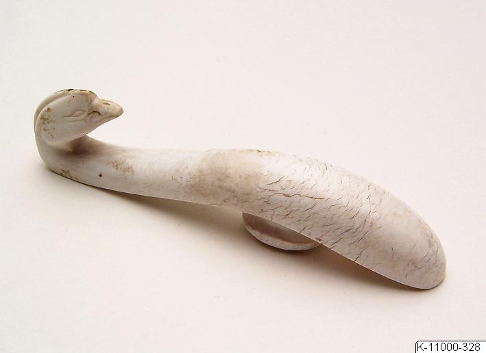 Dräkthake av sten i form av fågel. På baksidan en ditsatt etikett med numret "85", samt numret "528" skrivet med svart färg. Från låda märkt “Jader Ej gammalt (Diverse ej jader)”.