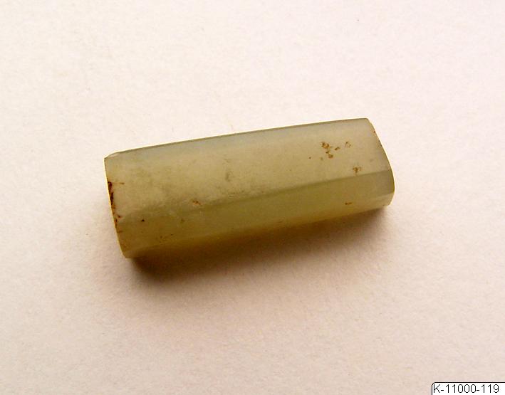 Åttkantig stav av jade. På föremålet finns numret “322” skrivet i svart färg. Från låda märkt “Jader Pre-Han”.