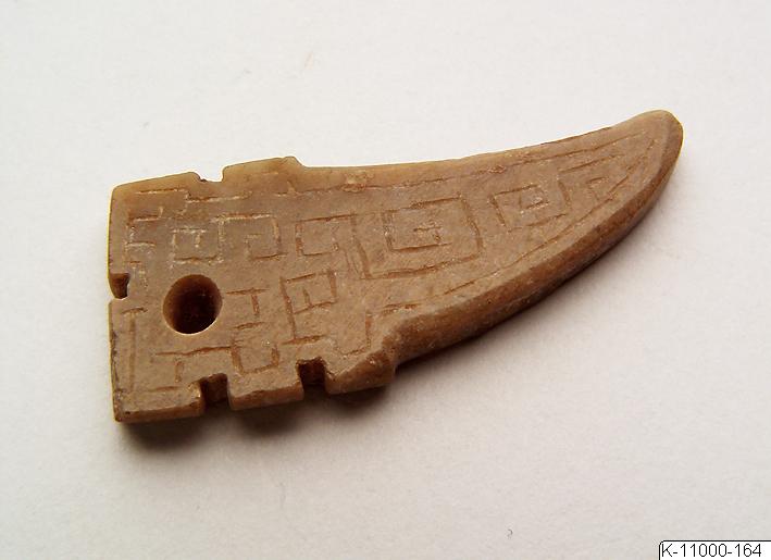 Föremål med på ena sidan inskurna geometriska mönster och ett hål. På föremålet finns numret “375” skrivet i svart färg. Från låda märkt “Jader Pre-Han”.