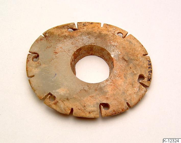 • Föremål med ornamenterad kant och inskurna mönster på ena sidan samt stort hål i mitten.