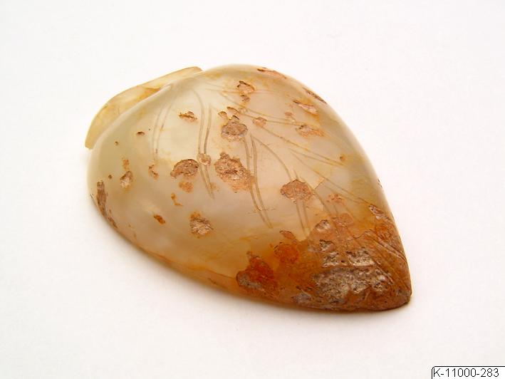 • Leaf-shaped pendant. May have used acid to induce corosion.