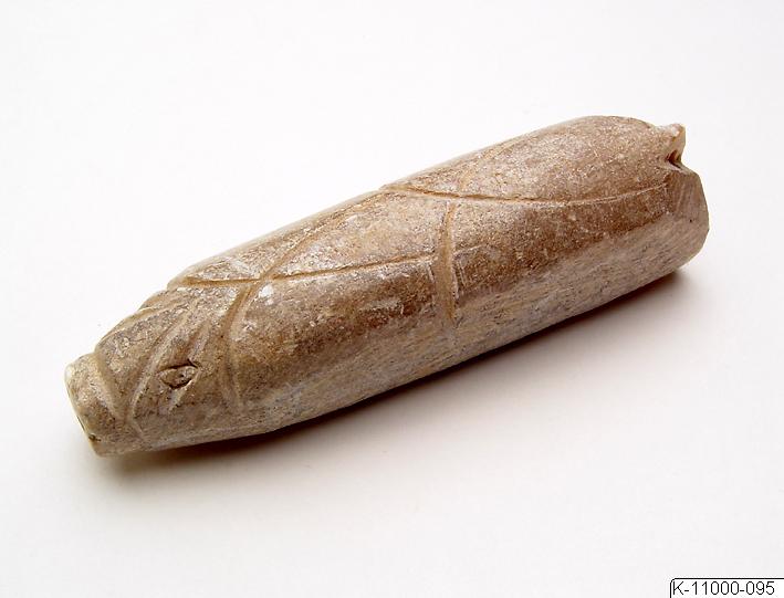 Långsmalt föremål i form av en gris. I var ände två små mötande hål. På föremålet finns numret “306” skrivet i svart färg. Från låda märkt “Jader Han Wei T’ang”.