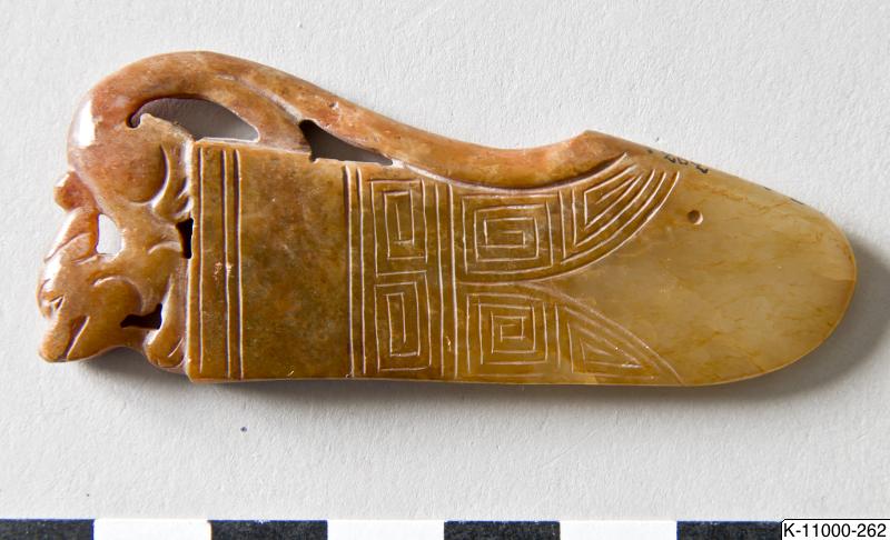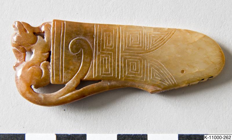 Föremål dekorerat med djur i genombrutet arbete och inskurna linjer. På föremålet finns numret “465” skrivet i svart färg. Från låda märkt “Jader Ch’ing”.
