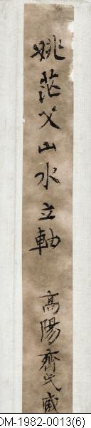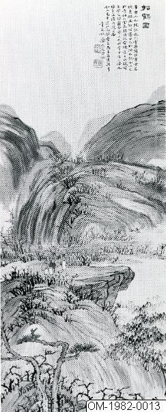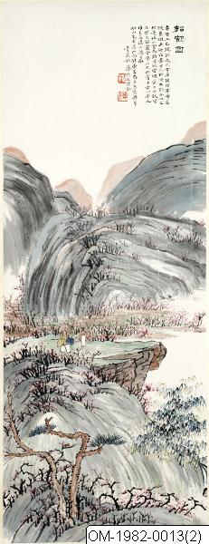"Kallande på en trana". Tusch och färger på papper. Vertikalrulle. Motiv: Bergslandskap. På bergssluttningarna låga träd med skära blommor. På en platå i mittgrunden står 3 skolarer och ser på en flygande trana.