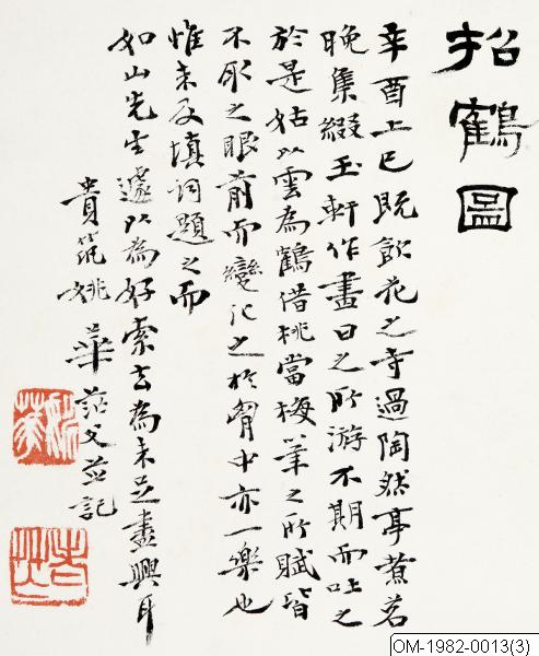 (Titel i lishu-skrift): Zhao he tu ("Målning då man kallar på en trana"), (Inskr, i kaishu-skrift): Xin you Shangsi ji yin Huazhisi, Guo Taorantinh zhu ming, Wan ji Zhuiyuxuan zuo hua, Ri zhi suo you...