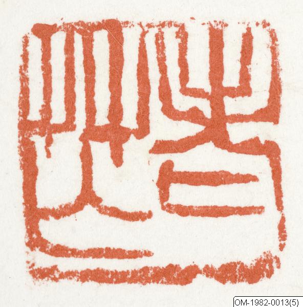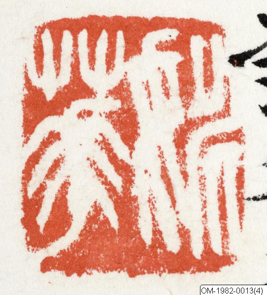 Efter inskr.: 1) Yao Hua (fyrkantigt, intaglio) 2) Laomang (fyrkantigt, relief)