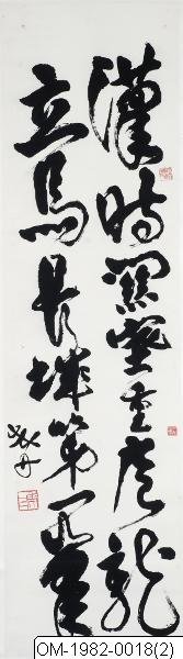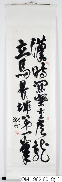 Kalligrafi i xingshu. Tusch på papper. Vertikalrulle. Zhu Dan - född 1916 i Jiangsu provinsen. Berömd kalligraf och konstkritiker.