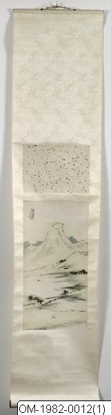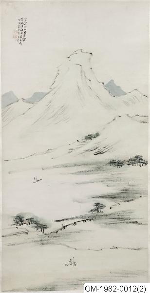 Landskap. Tusch och lätta färger på papper. Vertikalrulle. Motiv: En båt för fulla segel på en flod mellan bergen. I förgrunden två figurer med jordbruksredskap. På en bro har en man stannat upp, betraktande landskapet.