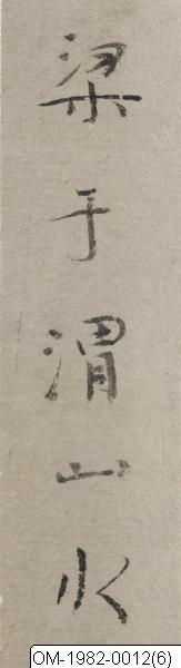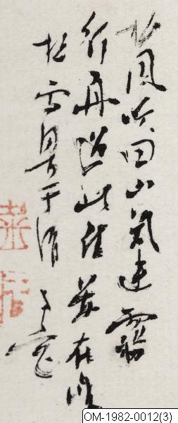 (Inskr, mycket liten och svårläst, Sista linjen nästan oläslig), Bei feng jin mian, shan qi jian wu, xing zhou tiao shan, wei? gong? zai gu? ("Kinden rörd av nordanvinden / Dimman skapad av bergens andedräkt / En båt i de fjärran bergen / Vördnadsfullt se