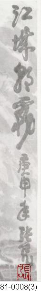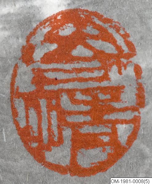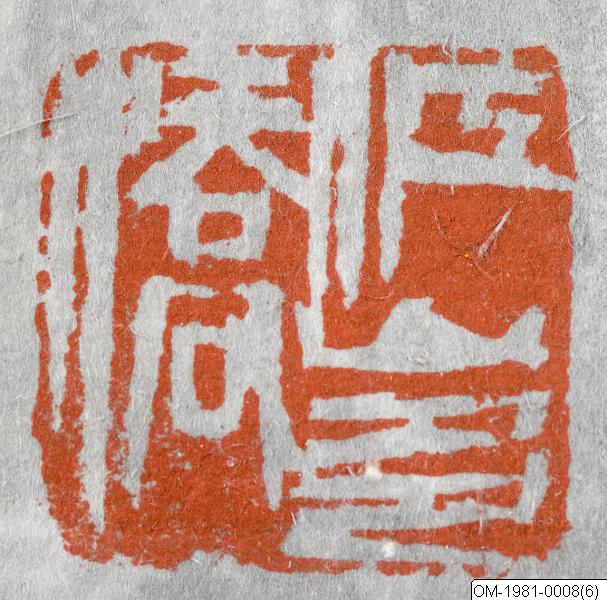 1) Under signatur:Zhang (rektangulär, relief) 2) Nedre, högre hörnan: Qi Qing (oval, relief) 3) Nedre, vänstra hörnan: (?)-qiao (kvadratisk, intaglio)