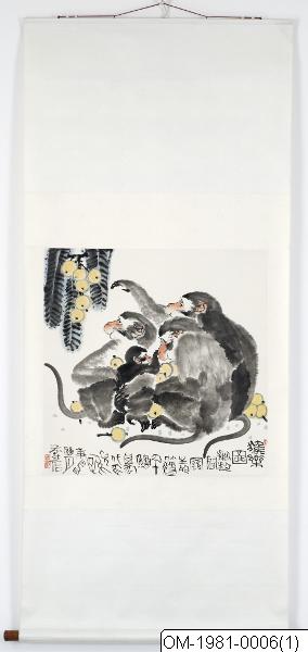 Lyckliga apor. Tusch och färger på papper. Vertikalrulle. Motiv: Apfamilj (3 vuxna, 1 unge) ätande loquats (pipa).
