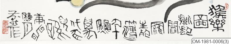 Inskr, i naivistisk sigillskrift: Hou le tu, que Yanluo sheng si bo, qian qiu suan shen you ersun, shi shen qiu yue, Yan zuo; "Målning av lyckliga apor: från Yamarajas (den nedre världens gud) förteckningar genom tusen kalpas /ser man att aporna/ får avk