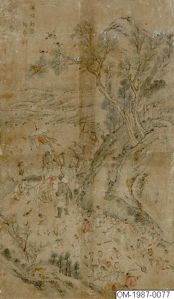 "Kijas ankomst till lägret". Ramad. Tusch och lätta färger på papper. Flodlandskap med stort träd med olika fåglar. Kija kommer ridande med följe på en smal väg längs floden, barn kommer springande för att välkomna honom. (Kija en feodalfurste under Shang, som flyttade till Korea då Shang-dynastin föll). Penselarbetet i figurmåleriet lätt och mycket drivet. Sannolikt kopia. A. Kalbaks samling (inköp) Sliten, lagningar.