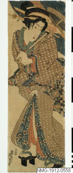 Träsnitt med motiv av en kvinna (kurtisan eller geisha) på höga lackerade träskor (geta). Hennes kimono är fylld av mönster och även bältet (obi) är mönstrat. Kakemono-e-format. /PH Stadsliv var ett populärt tema för japanska träsnitt. Motivet kallas ukiyo-e - den flytande världen. Särskilt kända var bilderna från nöjesvärlden i staden Edo (Tokyo) med sina scener från tehus, restauranger, teatrar och bordeller. En särskild genre är bilder av geishor klädda i rikt mönstrade kimonor, draperade i komplicerade veck. Figurerna är två dimensionella men parasollen och klädernas böljande linjer skapar en dynamisk rörelse. (Utställningstext, Nationalmuseum 2018, Japanskt och Japonism)