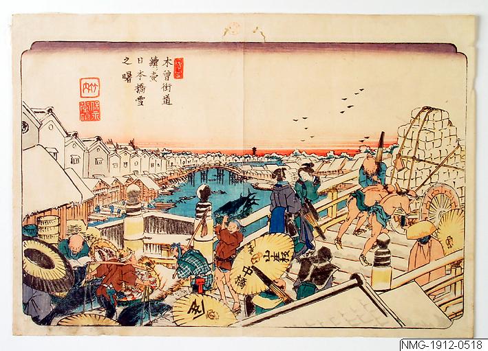 Gryningssnö vid Nihon-bashi Stadsbild från Edo. Osignerad. (Original Keisai Eisen) Förläggare: Takenouchi Magohachi (Hoeidô) Nihonbashi: Snowy Morning (Nihonbashi, yuki no akebono), from the series The Sixty-nine Stations of the Kisokaidô Road (here called Kisokaidô tsuzuki no ichi) Bilden är det första i serien "69 stationer längs Kiso-vägen" (Kiso Kaidō Rokujūkyū-tsugi), dvs bilder av de officiella rastställena längs en av huvudvägarna mellan Edo och Kyoto. Eisen inledde Kisokai-do-serien och gjorde sammanlagt 24 blad (av totalt 71), Hiroshige gjorde resten. Det var mycket vanligt att trycka om bilder, och här har man alltså återanvänt en välbekant bild och lagt till andra "sponsorer" (i paraplyerna). Den är också betydligt simplare i utförandet än ursprungsbilden samt ej signerad. Research av Mako Fukuda./PH Liknande bild: https://collections.mfa.org/objects/232470