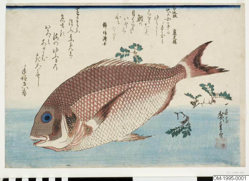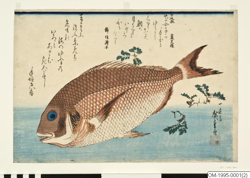 Titel: Röd havsruda och sanshô (Madai to sanshô ; A Red Seabream and Prickly Ash (or Japanese Pepper Tree)) Serie: En fisk-serie (Uo zukushi ; Fish Series) Två kyôka-dikter av (1) Shizugaki Namiyasu och (2) Toshigaki Maharu 1. Otomego ga Wrapped by young maidens Lindade av ungmön tedama mo yura ni and held at the end of a string och fast vid snörets ände kuridasu like glimmering jewels-- liksom glimmande juveler-- tai no mebari mo so is the net(pattern) så är nät(mönstr)et på of the seabream havsrudan ito wa hikikeri when the line is pulled in. när linan dras in. 2. Shibaura ni The red seabream Havsrudor arau akame wa bathed by Shiba Bay-- sköljda av Shiba-bukten-- Tago no ura no even the color även färgen yûhi no iro mo of the sunset at Tago Bay av Tago-buktens solnedgång asamu-kinu beshi. seems to grow pale. verkar blekna. Madai (Röd havsruda; Pagrus major) är en havsruda, tai, med vacker form och röd färg som kan bli 80 cm lång. Den äts vid nyår och har blivit en mycket populär gåva i Japan. Liksom äldre människor har fisken en puckel på ryggen som den sägs ha fått genom att simma mot strömmen. Den har därför, liksom karpen, blivit en symbol för långt liv och seger över svårigheter. Ebisu-ten, fiskarnas beskyddare och en av De Sju Lyckogudarna, visas oftast med ett metspö, en korg och en madai. Sanshô (Zanthoxylum piperitum; eng. Japanese pepper) är en planta med mogna frukter i oktober. Innanför fruktens röda kött finns en svart kärna. Den mals till en krydda som ofta strös på grillad fisk eller grönsaker. På våren används ibland unga löv på maten och när löven hackas upp och läggs i miso görs “grön miso” som serveras med grillad tôfu (dengaku).