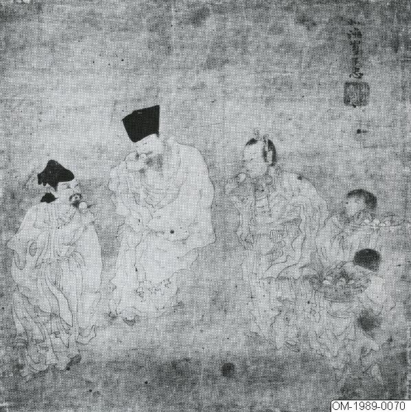 år. I en inskription på albumbladets motstående sida av Qing-connoisseuren Li Zuoxian har motivet identifierats som "de tre sura" (sansuan tu) . "De tre sura" är berättelsen om hur Su Dongpo och Huang Tingjian, två av Song-dynastins ledande intellektuella, tillsammans med monken Foyin, smakte på vinäger gjort på persikoblommor. Det är ett ovanligt motiv i kinesiskt måleri, den stora Yuan-målaren Zhao Mengfu skall , enligt en källa ha målat detta motiv, men denna målning är inte bevarad för eftervärlden. (Xuehai yudi, citerad i Zhongwen da cidian. Taibei 1973, vol.1, s. 267) I motsättning till vad historien berättar är det inte persikoblom-vinäger de tre lärda männen smakar, de biter bokstavligt talad i den sura frukten. Man frågar sig om orsaken till denna ikonografiska förändring - möjligtvis symboliserade den sura smaken av omogna persikor den sura eftersmak som följde det fåfänga sökandet efter odödlighet - persikor var en av de vanligaste symbolerna för odödlighet. Song poeten Su Shi (mera känd som Su Dongpo) , som står i mitten av de tre lärda männen, var en personlighet som Cui Zizhong djupt beundrade. Bland hans få målningar, finns inte mindre än tre olika motiv förbundna med denna diktare. Samtidigt kan motivet med "De tre sura" ha inneburit ytterligare en attraktionskraft för Cui. J.M. Rosenfield har påpekt att "De tre sura", tillsammans med det något vanligare motivet "De tre skratten" tillhör en motivgrupp som personifierar de tre troslärorna (dvs. konfucianism, taoism och buddhism). Cui hämtade idéer från alla tre troslärorna, och denna tolkning passar fint i hans övriga målningars ikonografi. (J.F. Andrews, The Significance of Style and Subject Matter in the Painting of Cui Zizhong. (Unpubl. diss.) Berkeley, 1984, pp.230-232.)