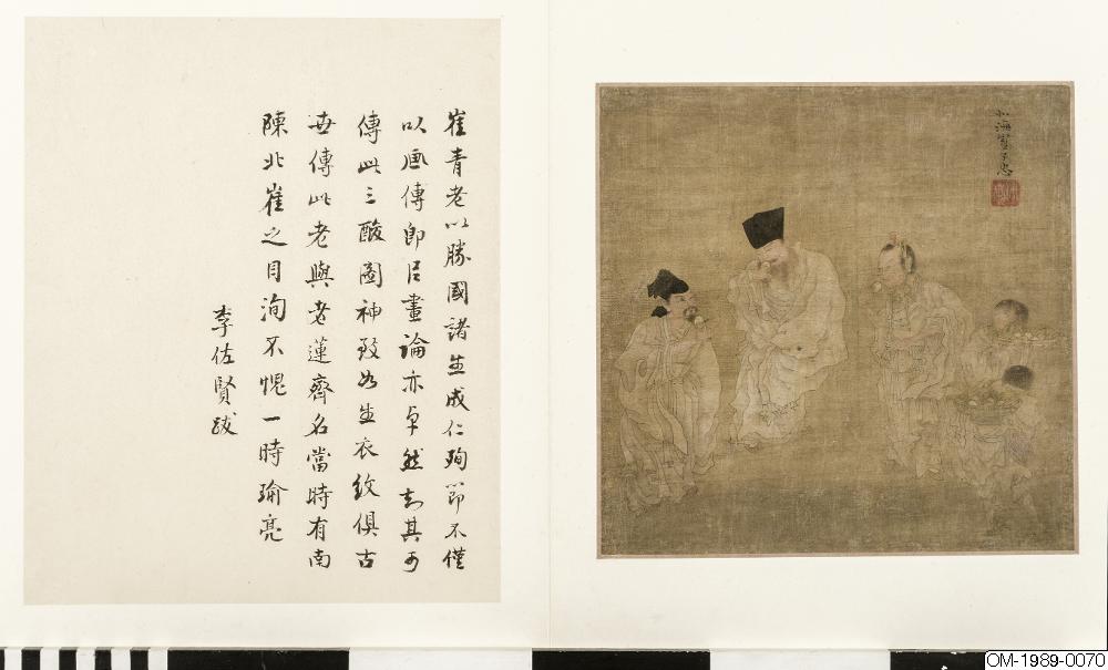 "Tre lärda män som äter frukt". Målning. Albumblad. Tusch och lätta färger på siden. Små lagningar. Cui Zizhong var en berömd figurmålare, verksam under slutet av Ming-dynastin. Hans personlighet är beskrivit i en kort biografi, skrivit av hans vän Qian Qianyi: "Zizhong, med tillnamn Daomu, var från Laiyang [Shandong], men bosatt i huvudstaden. Hans yttre var rent och ädelt, med en ålderdomlig pr...