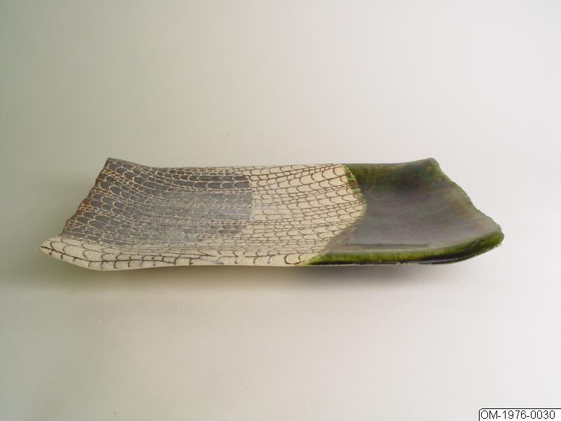 • Fat av Oribe-typ med ljus, gråbrun och grön glasyr samt inristat mönster. Utförd av Toshisada Wakao 1976