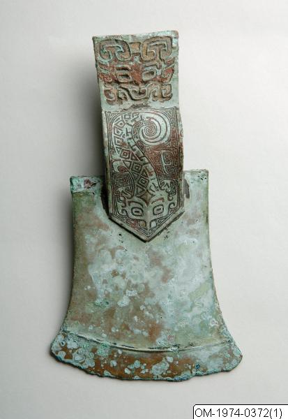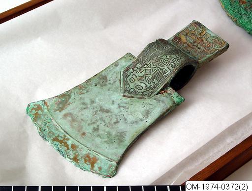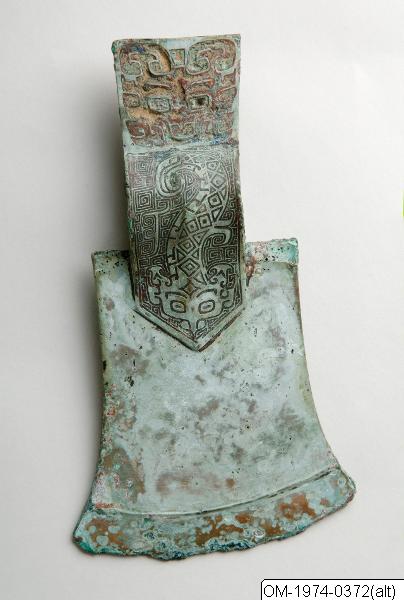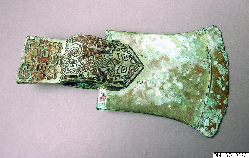 OM-1974-0372 Sacrificial ax with tang and shaft-ring. Bronze. Asymmetrical. The tang with decoration of taotie-mask with traces of inlay. The shaft-ring with decoration in relief continued at the blade in a cusp-like shape – the decoration showing a dragon against a background of “cloud-and-thunder”-pattern. Shang, Anyang-period. L.: 20 cm W.: 11.1 cm Gustavus VI Adolphus Coll., who purchased it from O. Karlbeck 1943. Publ.: SCA, pl. 104; D. Lion- Goldsmidt: Chinese art. Pl. 24;USA 1966, (colour pl.), Stockholm 1967, No. 19; Danmark 1975, No.5