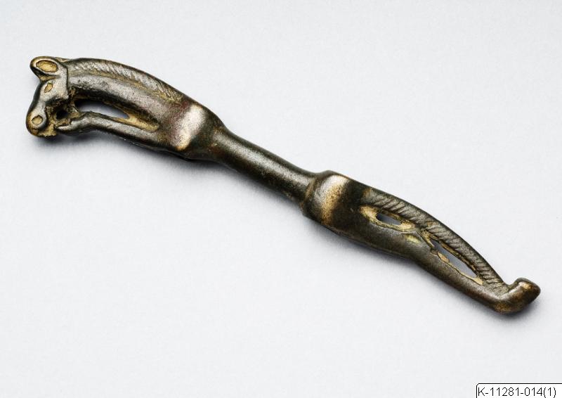Cheek-piece, for a horse bridle, in the shape of an attenuated racing horse. Pierced by two holes,one at the shoulder, the other at the haunch. The divided ends of a headstall cheek strap would pass ...