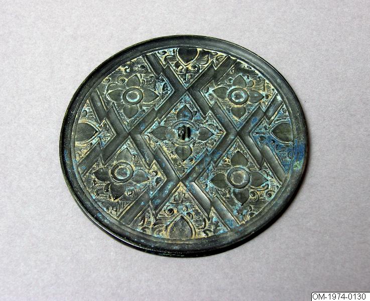 Enligt katalogkort: Spegel av Huaityp. Material: Svart patinerad brons med blå lazuritkrustor.