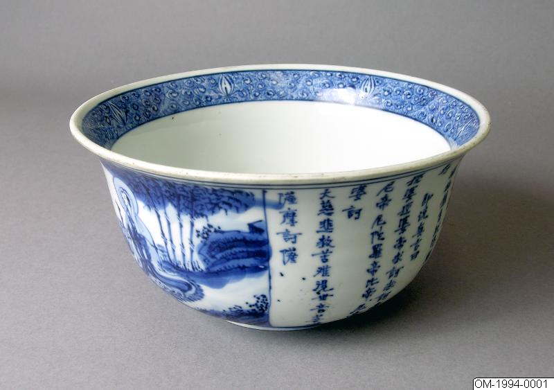 Skål, porslin, underglasyrblå dekoration med text och illustration från Amitabha-sutran. Ming, Tianqi 1621-1627 Gåva från Ulf Alhsell. ÖM-1994-0001