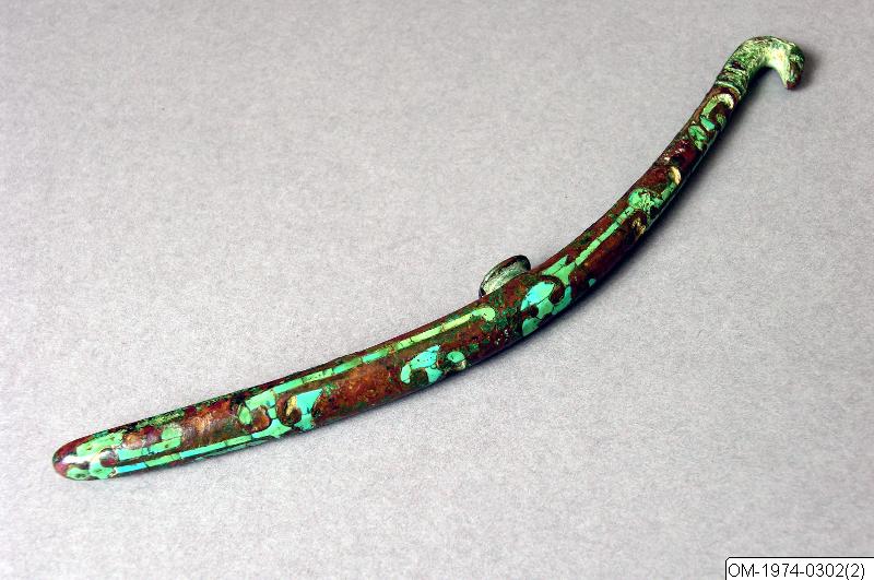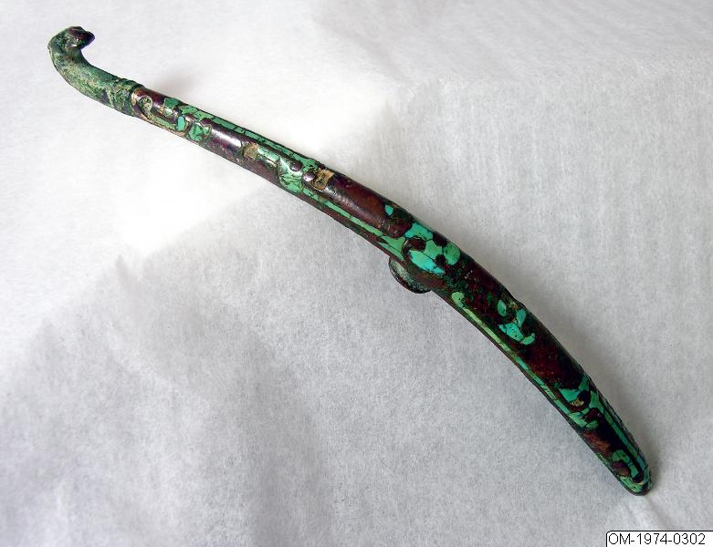 Dräkthake av brons med inläggningar av guld och turkos Stridande staterna (475-221 f.Kr.). Gustav VI Adolfs samling. OM-1974-0302