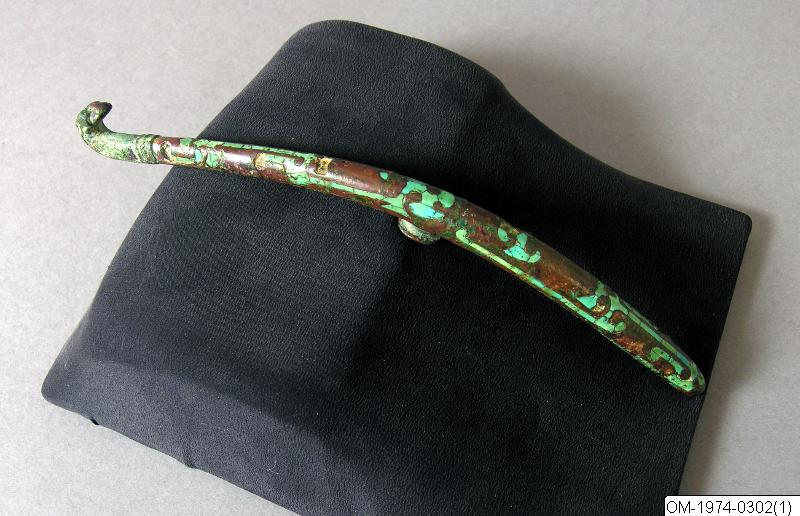 Dräkthake av brons med inläggningar av guld och turkos. Själva dräkthaken i form av fågelhuvud med spår av förgyllning. Enligt katalogkort: Dräkthake lång och bågböjd. Spår av förgyllning på baksidan. Turkosinläggning. Material: Brons