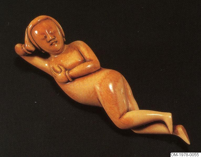 • Skulptur av elfenben föreställande liggande naken kvinna, från Kina. Föremålet fanns med på utställningen Från Kina till Europa, se katalog s. 248.