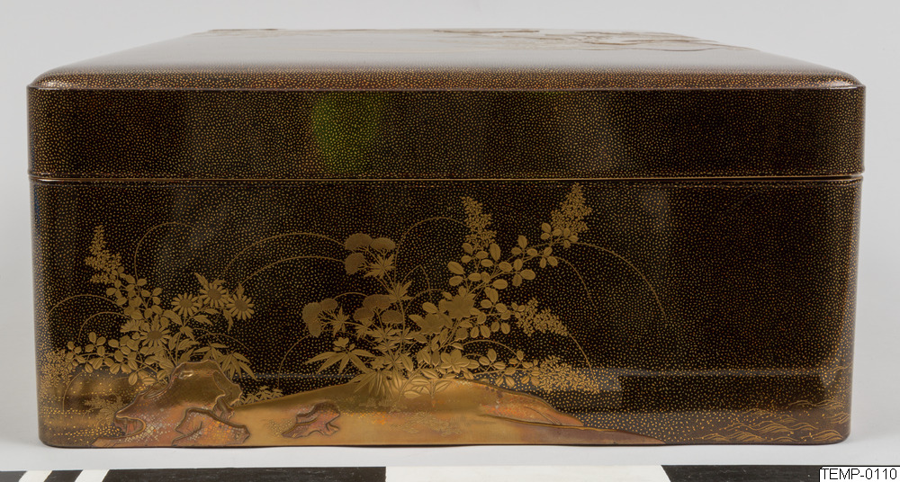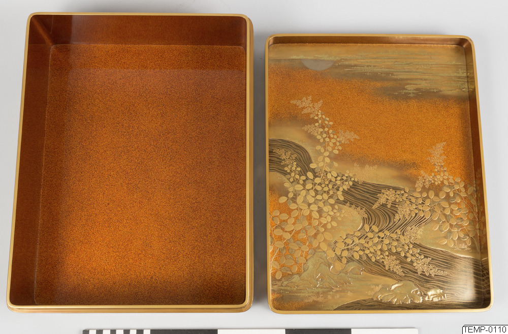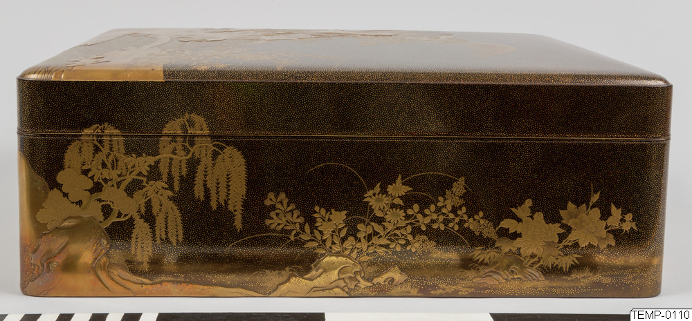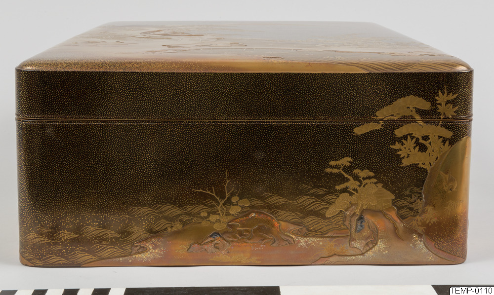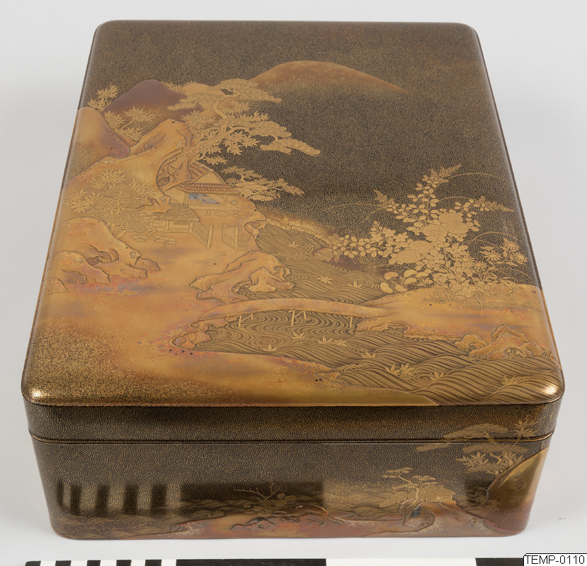 • Stor ask av lackerat trä, från Japan. Asken är dekorerad med guldlack i rika mönster, på lockets utsida föreställande hus bland berg, på lockets insida växt- och blommotiv i olika guldfärger. Askens insida är dekorerad med metallpuderlack.