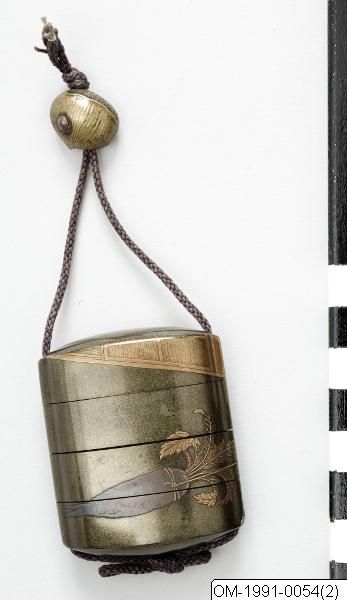 ÖM 1991 : 054a Tredelad inro i guld- och silverlack i låg relief (hiramaki-e). Eventuellt avsedd för ett barn pga sin ringa storlek. Inro utförd av Koma Kansai.