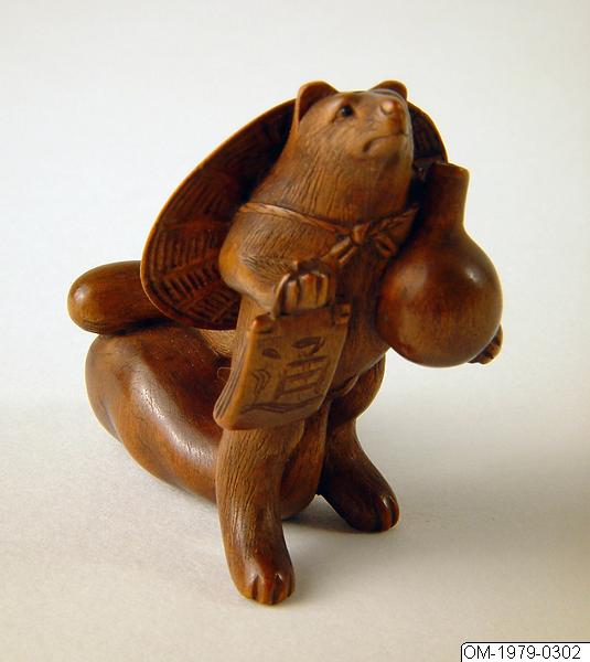 Netsuke in the shape of a tanuki (raccoon dog) holding a sake bottle and a bill of exchange. The kimono having no pockets, accessories have to be carried somehow. Women could put small objects in their sleeves and sash, whereas men, mainly, would hang their various boxes, pipes and brush cases on a cord at their belt. The portable objects are called sagemono. Accessories became identity-forming status objects and an important part of men´s fashion, a world in miniature with a wealth of subjects. Various kinds of artistically crafted sagemono are known from the 17th century. In addition to boxes for tobacco, cases for personal seals (inro) are one of the best-known types. Literally translated, an inro is a basket (ro) containing a seal (in). Only sealed signatures were legally valid, and so samurai and merchants, for example, needing seal stamps had to carry them in small cases. This was the origin of “seal baskets” (inro), which soon came to be used primarily for carrying medicine. These accessories varied in appearance according to the wearer’s taste and wealth, as well as fashion trends. When Western dress became popular during the Meiji period (1868-1912), there was less need for these portable objects, and they were divided up into their constituent parts (with toggles kept apart) and sold to westerners. (Based on the text for the exhibition catalogue Japan. Artefacts and images tell the story. 2011). The function of the netsuke item is to be a counterweight to the "hanging things" (sagemono) worn with the kimono by the men. Common hanging items were various boxes, for example medicine boxes (inro) and tobacco pouches. Netsuke roughly means "fixed root" and early netsuke (before the late 17th century) were probably natural, unprocessed roots and the like. From the 18th century they were made more representative and often in wood or ivory. Eventually, the artists began to sign their netsuke. (Based on the text for the exhibition Japan. Artefacts and images tell the story. 2011). /PH