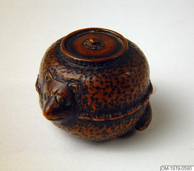 Netsuke of wood depicting a raccoon-dog (tanuki) on its way to be transfornmed into a tea kettle (old Japanese tale: Bunbuku Chagama). There are several versions, here is one: At a temple called Morin-ji in Kōzuke Province (now Gunma Prefecture), the head priest owns a chagama (tea kettle). When the priest places the kettle on a hearth, it is transformed into a half-tanuki (raccoon dog).