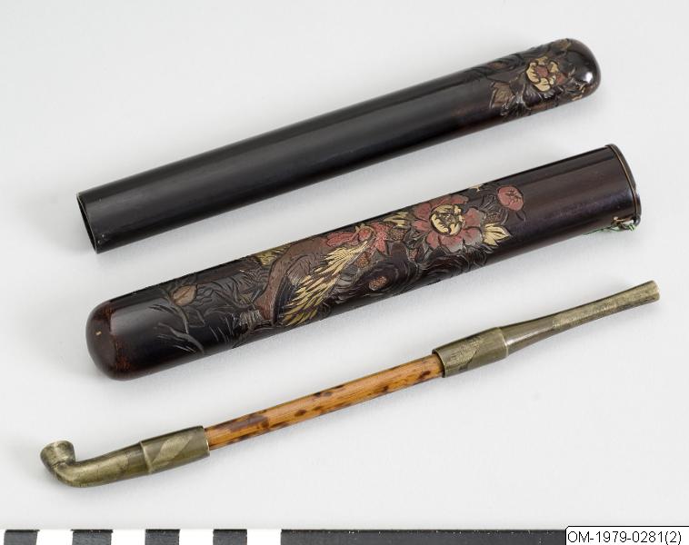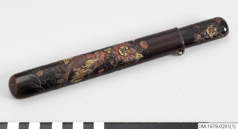 Pipfodral i svart lack med tupp och höna. Signerad: Kusayuki. 1800-tal. Lack: teknik och funktion Den japanska lacken kommer från lackträdet (Rhus verniciflua/vernicifera) som är släkt med mango och cashewnöt i familjen sumakväxter. Det finns flera besläktade lackträd som kan ge lack. Trädet tappas på sin sav ungefär som när man tappar gummi. Efter tappning dör trädet. Saven filtreras och är i sin flytande form eksemframkallande. Den är nästan ofärgad. Genom pigment färgas lacken, t ex svart (med järnoxid) eller röd (från kvicksilver). Lackens funktionella betydelse ligger i att den skyddar underlaget. Vanliga underlag är trä, men även metall, textil, papper och keramik. Lackeringen består ofta av ett 50-tal faser och börjar med grundning, en blandning av lack, bränt lerpulver och stenpulver. Sedan följer slipning. Själva lackeringen sker ofta i flera lager. Varje lager behöver härda i ett dammfritt skåp med ca 80% luftfuktighet. Polering är också ett viktigt moment. Tidsåtgången för ett exklusivt lackföremål kan vara upp till tio år. Vanliga dekorationstekniker är inlägg av bl a pärlemor samt pulveriserade metaller (maki-e). Lacken användes på t ex rustningar och under andra världskriget som rostförebyggare på vapen. Guldlack används även vid lagning av keramikföremål, där det icke-perfekta sätts i fokus genom lacket som en medveten del i estetiken. Hantverk: exemplet lacktillverkning De största lackproducerande områdena idag är Tokyo (Edo-lack), Kyoto (Kyo-lack) och Kanazawa (Kaga-lack). Andra viktiga platser för lacktillverkning med lång historia är Wajima, Takayama och Takamatsu. Lackarbeten har använts i Japan som konstföremål och vardagsföremål åtminstone sedan mitten av Jomon-perioden (ca 10500–300 f v t). Nya fynd kan troligen dateras till ca 7000 år f v t. Omkring 586 e v t startade en lackavdelning inom finansministeriet för att effektivt kunna organisera lackproduktionen. Buddismen kom till landet under samma tid och man började göra religiöst relaterade föremål som skulpturer och tempelinredningar. Användning av pulvriserade metaller är belagd från 700-talet, bl a i form av ”strödd bild” (maki-e) som anses unikt japansk. I Heian-periodens (794–1185) mest berömda berättelse, Genji monogatari, nämns rikt dekorerad lackinredning och lackföremål. Under Edo-perioden räknades lackträdet som ett av de ”fyra viktiga träden” tillsammans med tebusken, mullbärsträdet som man gör papper av (Broussonetia papyrifera) och mullbärsträdet som man matar silkeslarver med (Morus alba). Lackråvaran användes t ex som skattebetalning. Under Edo-periodens mitt började även förmögna handelsmän beställa exklusiva lacker med guld och pärlemorinläggningar. Lackföremålens stora betydelse i Japan jämförs med bruket av porslin i Kina. När européerna kom till Japan i mitten av 1500-talet blev de fascinerade av lackerna. Lacker var hett eftertraktade och gick på export till Europa, särskilt den typ som kallas namban-lack, som ofta har pärlemorinläggningar. Européerna försökte också att imitera den japanska lacken utan större framgång (”japanning”). Under 1900-talet har flera åtgärder vidtagits för att både bevara och kreativt utveckla lackkonsten. (Baserad på text från utställningskatalogen Japan. Föremål och bilder berättar. 2011). /PH