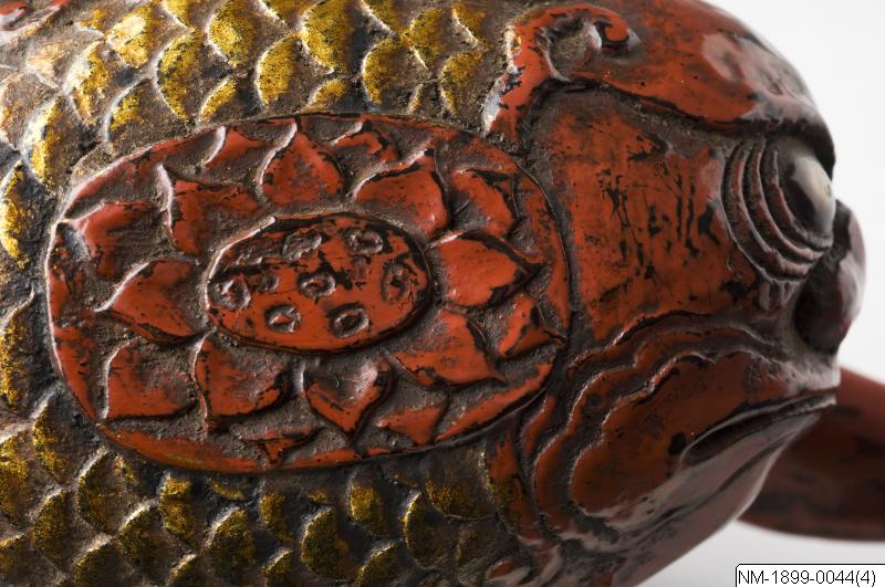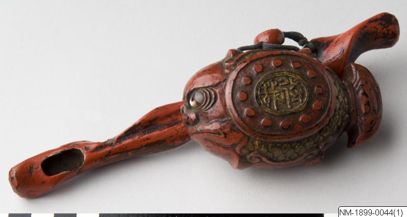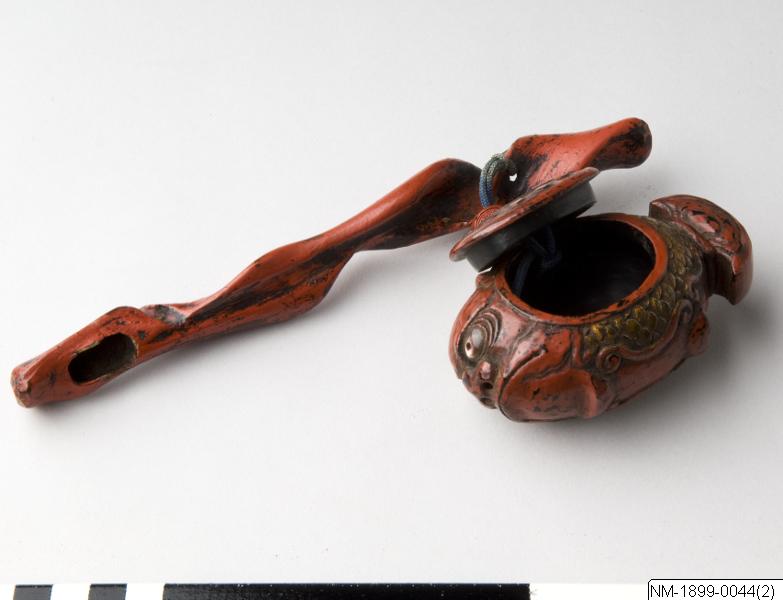 Tobakdosa i form av en fisk (i äldre katalog spec. som "butta" = piggvar) med dekorativa ögon och fjäll. I tobaksdosan hänger även en mindre pipa. Både dosa och pipa är rödlackerad. Dosan är signerad på locket.