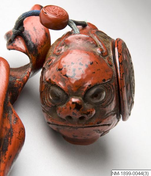 Miniatyrskulpturerna, ofta kallade bältesknappar, (netsuke) rymmer en hel värld att utforska. Myter är ett stort motiv. Ofta var designen lyckobringande och inte minst underhållande.