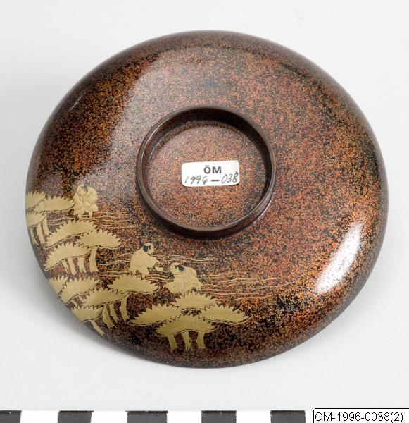 Nashiji-grund med dekor på fram- och backsidan i guldlack med detaljer i svart lack föreställande män, kvinnor och en pojke som plockar snäckdjur bland vågor vid en strand med tallar.